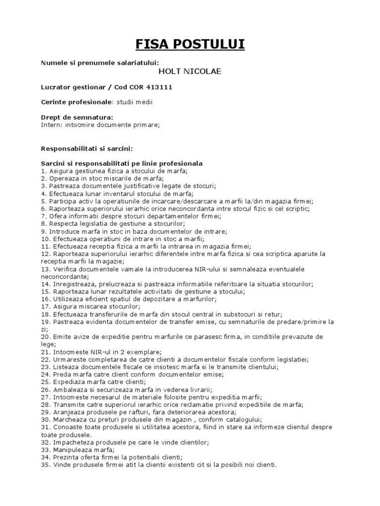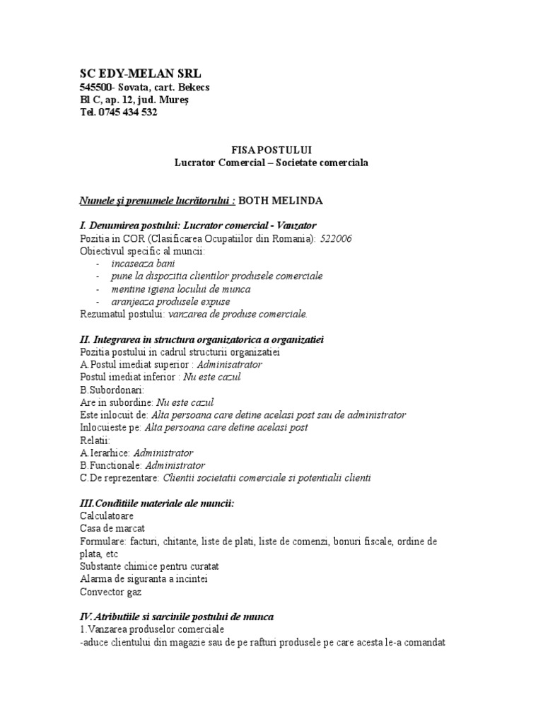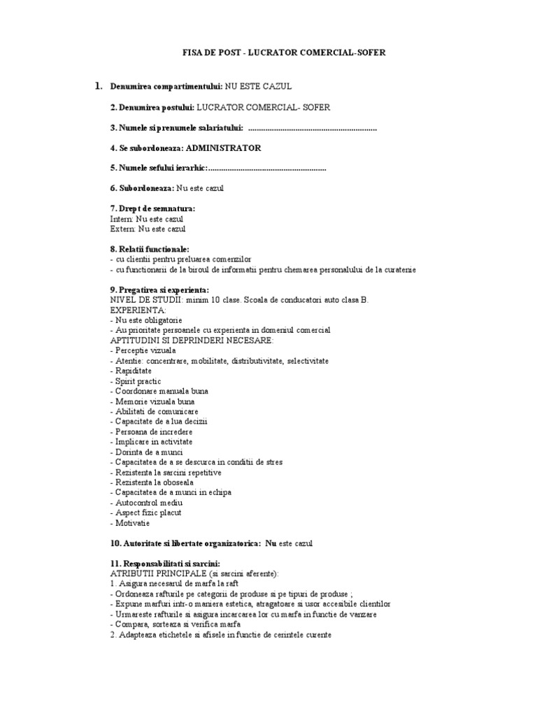 Model Fisa Post Lucrator Comercial Vanzator Doc