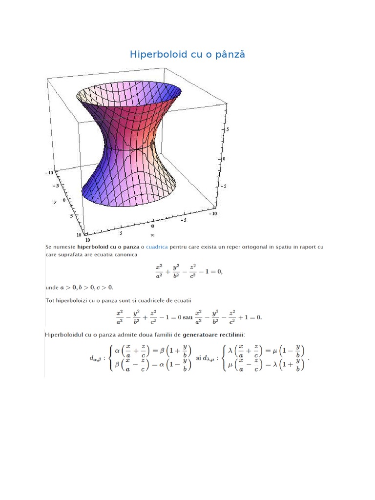 Hiperboloidul Cu Doua Panze Suprafata Lui E Caracterizata De Ecuatia