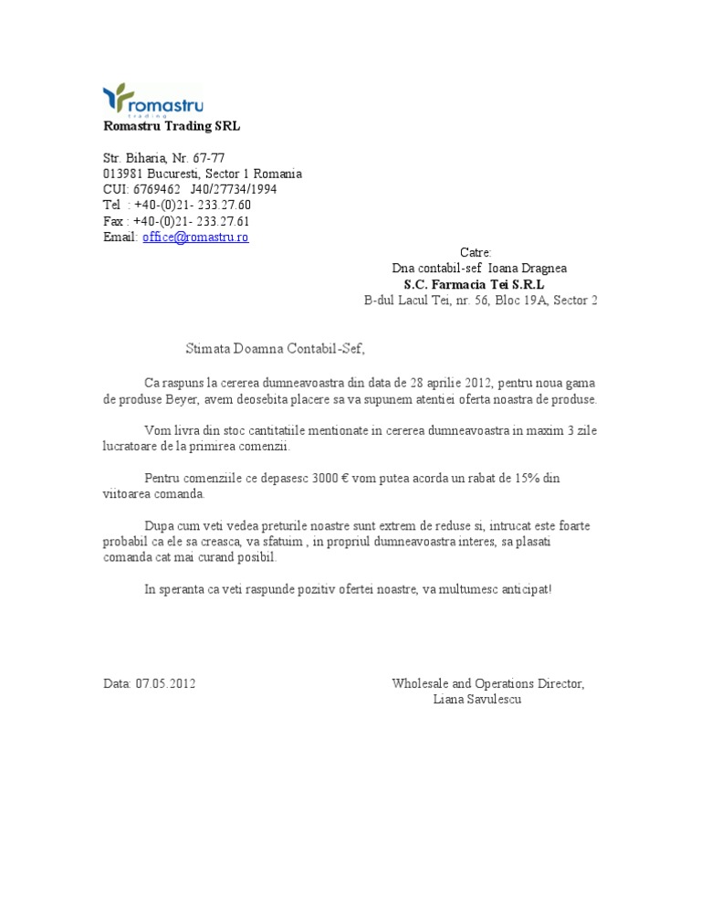 Model De Scrisoare De Multumire Dupa Primirea Unei Oferte