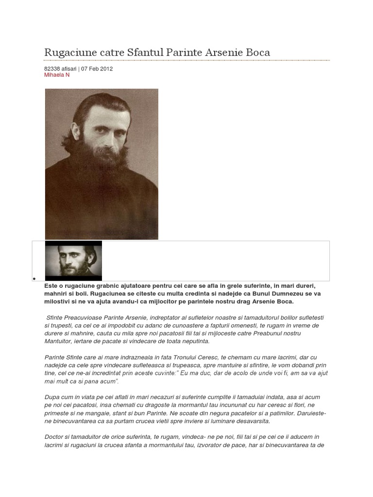 Rugaciune catre arsenie boca. Rugăciune către sfîntul parinte arsenie boca este o rugaciune grabnic ajutatoare pentru cei care se afla in grele suferinte in mari dureri mahniti si boli. Rugăciune a părintelui arsenie boca. Doamne iisuse hristoase ajută mi ca astăzi toată ziua să am grijă să mă leapăd de mine însumi că cine știe din ce nimicuri mare vrajbă am să fac și astfel ținând la mine te pierd pe tine. Iată care este rugăciunea lui arsenie boca.
