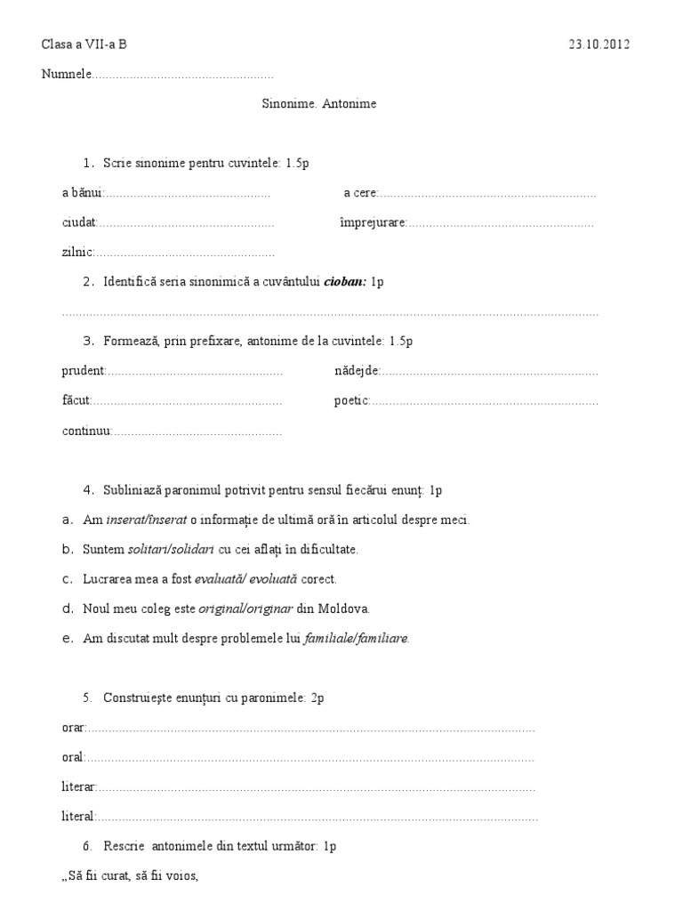 Proiect Didactic Sinonime Antonime Omonime Paronime