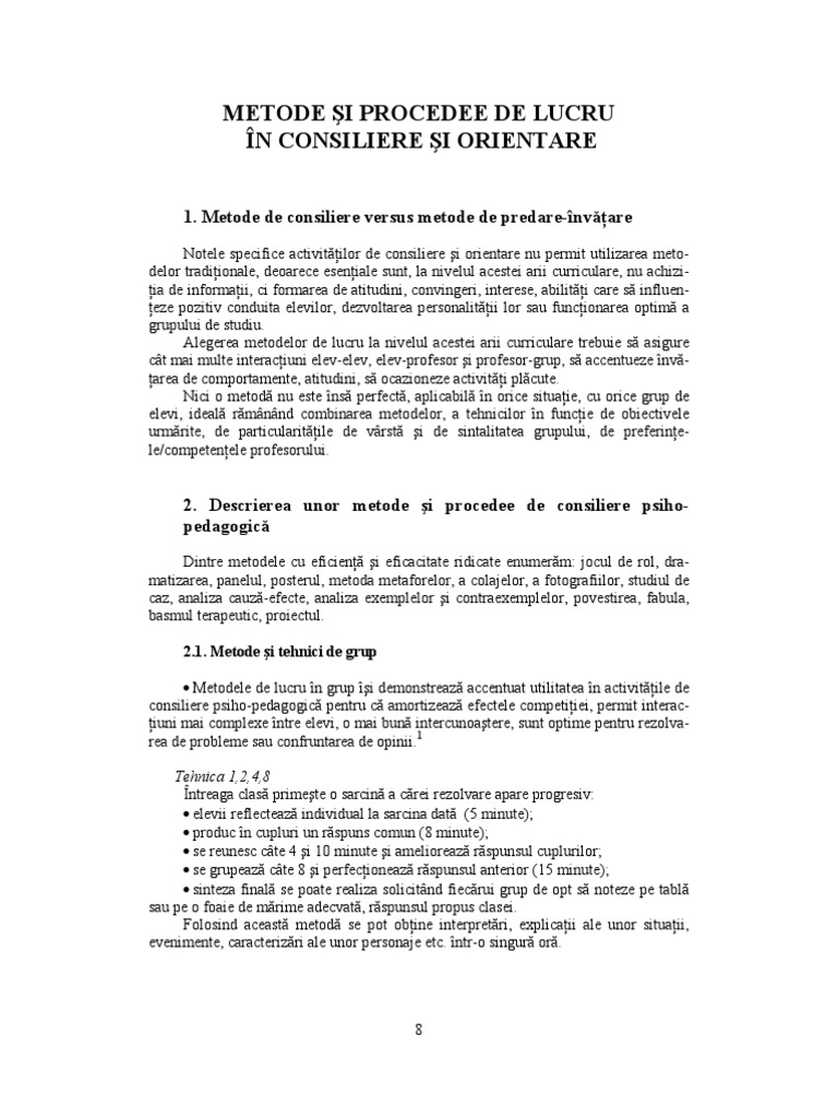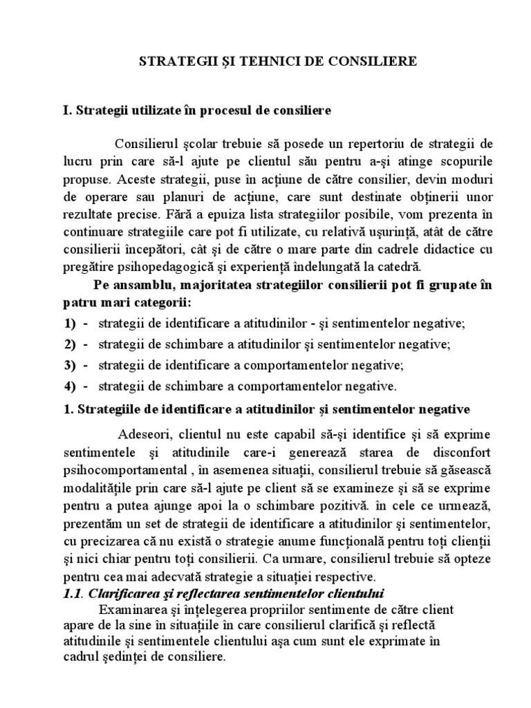 Tehnici de consiliere psihologica. Altfel spus consilierea reprezinta în mod simultan relatie umana. Mai jos poate fi vizualizat un extras din document aprox. Reflectia meditatia afirmatii cu accent pe sentimentele prezente. Omului sanatos aflat in dificultate caruia ii confera confort moral si o mai buna.