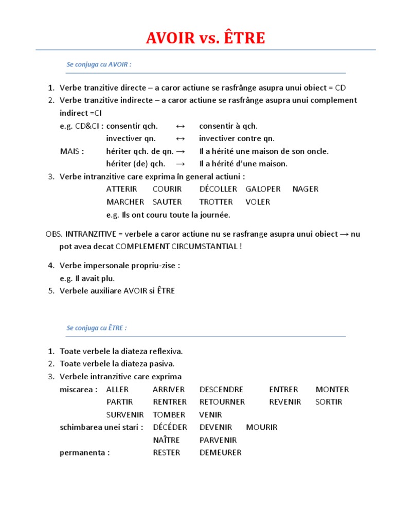 Verbele care au un pronume de forma se atunci se conjuga cu etre. Cu auxiliarul être se conjugă. Verbele auxiliare ajută la formarea timpurilor şi a modurilor compuse. Sortir a iesi dar nu si sortir a scoate care se conjuga cu avoir.